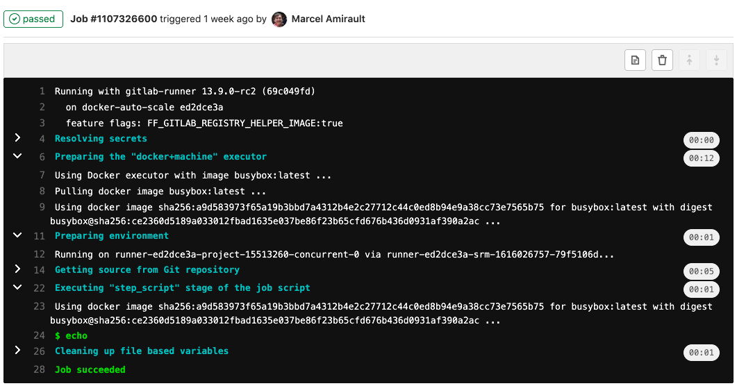 To enable timestamps in job logs, add a FF_TIMESTAMPS CI/CD variable